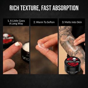 Na tattoo nanesi mazilo in ga dobro razmaži. Če je tattoo večji, priporočamo, da mazilo naneseš na različnih delih in ga potem dobro razmažeš po celem tattooju. Učinek delovanja bo viden že po nekaj minutah, saj bo koža bolj elastična in sveža na pogled. Če barve tvojega tattooja še niso preveč poškodovane ali zbledele, bodo ponovno prišle do izraza in bodo bolj intenzivne. Ob redni uporabi (vsaj 2-krat tedensko) bo tvoj tattoo ohranil svež in sijoč videz, upočasnila pa se bosta tudi pokanje barvnega pigmenta in bledenje tattooja.